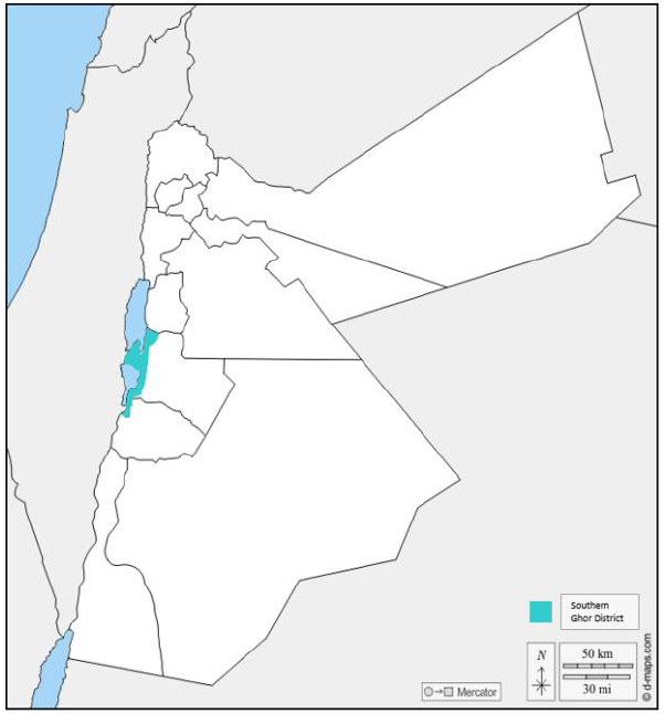 Southern Ghor District is a district located in the Jordan Valley southwestern part of Jordan, in the Karak Governorate. It covers an area of approximately 350 square kilometres and is home to a population of around 65,000 people. The Southern Ghor district is made up of 2 subdistricts: Ghor Al Safi and Ghor Al Mazara’a. According to the Department of Statistics, poverty rates in Southern Ghor, Ghor Al Safe, and Ghor Al Mazara’a are 45.4%, 61.9%, and 21.4% respectively.